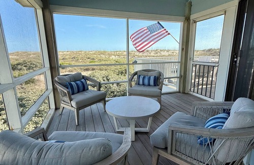 The front porch is a dream that has seating that faces the ocean for your perfect sunset cocktail or meal while hearing the ocean waves crash. There is also a screened in porch in the family room that is perfect for morning coffee or relaxing.