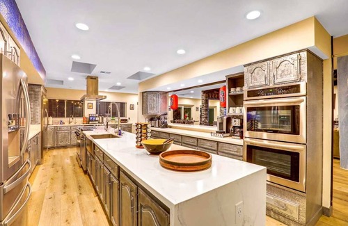 Upon entry into the compound you are welcomed by a mural of Japanese Warriors and beautifully manicured bamboo trees. Immediately beyond this wall you are engulfed by a zen garden that include water features and multiple lounge areas, providing a perfect space for yoga at sunrise. Once inside, our contemporary home satisfies guests with the finest in luxury showcased at every turn, every texture and every amenity featuring the modern elegance of Room & Board furnishings. Unwind in the large open great room with plentiful entertainment such as billiards & poker, or have a beverage while sitting at a sleek Japanese-inspired bar. The floor to ceiling Japanese art is also to be admired. A gourmet grand kitchen with a double oven, a double stove and a double fridge awaits the chef in you! A wine cooler at the end of the ginormous island allows for perfectly tempered wine and beer. Our 13 Flat screen 70 inch TV’s with access to hundreds of channels will keep you up-to-date with what’s happening in the city.