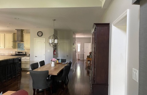 Beautiful brand new custom home situated on 1.5 acres of secluded land. 45 mins from NYC, two miles from train station to NYC, and 1 hour from Jersey Shore. The home has a first floor master suite with walk in closet & bathroom. Upstairs has two bedrooms and bathroom. Finished basement with a movie room, surround sound and reclining sofas. Access to full kitchen and laundry as well as two separate living rooms w/ pull out couch. Super fast WiFi (500+Mbps). No pets allowed.