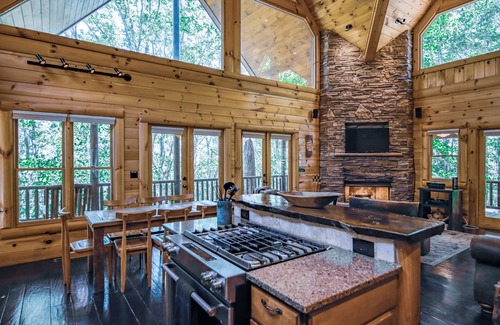 Most importantly, the location of The Summit is unsurpassed for all of your vacation needs. It can be reached by a short drive from the town of Blue Ridge down Aska Rd which is one of the most beautiful drives in the Blue Ridge area, or by Rock Creek and Stanley Creek Rd. which winds through a canopy of forest as it makes it's way through the Rich Mountain Wildlife Preserve. Excellent hiking and trail heads are 3 miles in either direction down Aska or Stanley Creek Rd., with a beautiful waterfall easily accessible from the Stanley Creek Rd. trail head. The entrance to the mountain where The Summit is located is within walking distance of the Toccoa River where an abundance of trout fishing and rafting are available. It's location is also less than 1/4 mile to the Toccoa Riverside restaurant which sits along side the river with great views of the rushing waters below, and specializes in freshly caught trout. Another 1/4 mile down from the restaurant is the Toccoa Wilderness Outpost which offers rafting gear, grocery supplies, as well as a full breakfast menu each morning and home made barbecue for lunch. Just on the other side of the river is beautiful Lake Blue Ridge. The lake can be accessed by boat launch 5 1/2 miles down Aska Rd or by driving another few miles to the marina. Pontoon boats and jet ski rentals are available by the day or half day. In addition, less than an hour away, the Ocoee River with class 3, 4, & 5 rapids offers some of the best adventure rafting and kayaking in the region. If adventure isn't on the agenda for the day, the charming town of Blue Ridge offers a beautiful setting to take in it's quaint shops and cafes and it is also the departure location for the famous Blue Ridge Scenic Railway. This cabin has a unique blend of refinement and unquestionable rustic charm which is complimented by it's one of a kind settings. It is our hope that this combination allows you to better feel the distinctive beauty as well as the rugged wilderness that are both hallmarks of the North Georgia Mountains and serve as the perfect site for this unparalleled get away that we call The Summit.