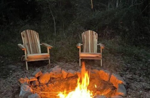 Enjoy the outdoors! Swim in a fresh water creek to cool down in the summer or sit by a warm fire when it's cold. A bubbling creek with clear water, a romantic water fall near your private fire pit, trails outside your door, fresh water bass fishing, trees and nature as far as the eye can see, fresh eggs in the morning! The cabin has everything you could need fora weekend of Glamping! A kitchenette with all the utensils necessary to heat up a quick meal or grill your day’s catch on our charcoal grill. Restaurants are a few minute’s drive from our property too. There is a queen bed and a fold out twin futon available. The bathroom has a standup shower. The cabin is perfect for couples or a small family. Bring your fur baby along!