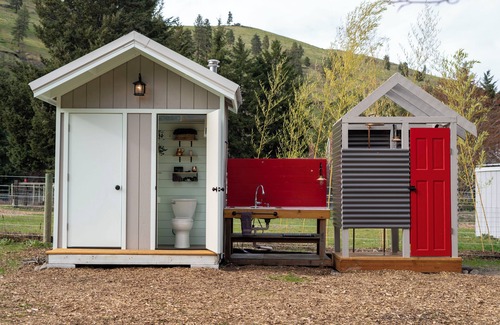 Unwind in The Dalles Oregon at this terrific glampsite. This cozy retreat features a heated queen bed, full bathroom with an outdoor hot shower and hot bathtub on the creek, and essential amenities like WiFi, AC, and heating. Total privacy - just you and the alpacas. Whether you're looking to relax unwind and explore the outdoors, this wonderful "glamorous camping" experience is the perfect spot for guests seeking a peaceful getaway. Pancake mix and eggs laid that day are provided in your open-air kitchen. We look forward to welcoming you to our place.