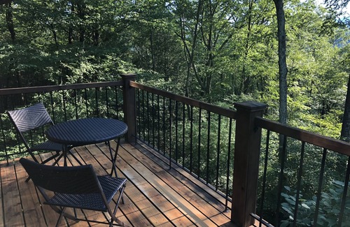 This secluded "Frank Lloyd Wright" inspired home can become your own private mountain retreat. Designed like a luxurious treehouse, the multi layers of porches and decks makes one feel as if they are sleeping in the clouds. You will never want to leave.