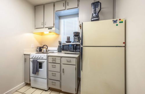 As you walk into the spacious living room, enjoy the benefits that come with a cozy couch and plush armchairs that sit serenely in front of a large flat-screen television for those moments when vacation calls for some digital entertainment. The living room opens up onto the fully equipped kitchen complete with ample counter space, modern appliances and utensils, and cooking accessories to whip up something savory at a moment's notice. The dining room table for three does a wonderful job of balancing the space between the kitchen and the living room.