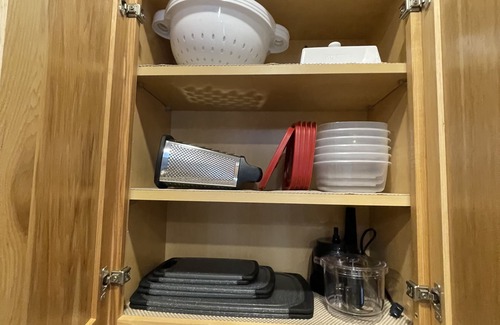 Or, if you prefer, gather in the family room to watch TV in front of the fire. Overall, the downstairs layout and decor is modern and functional for several couples or a family. We provide a well-stocked kitchen space that provides our guests all the starter household items needed for a stay including organic spices, olive oil, bottled water in the fridge, garbage bags, dishwasher and laundry detergent pods, lint roller, iron, and a roll of paper towels. The coffee bar has regular and decaf K-cup coffee pods, tea, sugar, honey, a variety of creamers, and grab-and-go snacks.