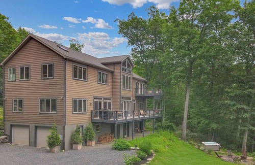 This is an incredible house for groups, with spectacular views from almost every room. The main level is a massive open living room/ kitchen/ dining/ fireplace on one level and a sweeping sunny deck. The home features 3 main bedrooms with ensuites, plus 2 big bedrooms, a total of 5 bathrooms, and a yoga room with views. The perfect, most central Catskill location gives you access to restaurants, farm stands, hiking, <30 mins to Hunter skiing, Phoenicia, Woodstock, etc. Breathtaking views!