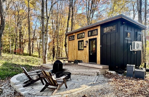 The Hemlock Tiny House is a modern and cozy single-story tiny house featuring a large 7x7 foot window overlooking the beautiful wooded hillside, a queen bed with a great view of nature, full kitchen and bath, and great outdoor space among mature trees to enjoy an evening campfire and the night stars. Nestled on a private wooded hillside less than an hour southeast of downtown Columbus, this tiny house has all the comforts of home – just bring your toothbrush and a change of clothes and you're all set to enjoy the renowned Hocking Hills trails and all the nearby restaurants, wineries, breweries, coffee shops, and other great adventures!