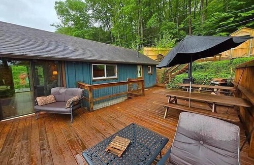 The Moose Lodge is a two-bedroom, one-bathroom cabin with an open loft. One bedroom includes a queen bed and twin bunk beds separated by a partial wall. The loft offers another queen bed, accessed by stairs. The home features a full kitchen with a slightly smaller-than-standard stove, cookware, utensils, and coffee maker. There is a standing shower in the bathroom, an indoor wood-burning fireplace, and a mini-split system for heating and cooling. Firewood is provided. Outside, guests can enjoy a large deck, firepit, and private riverfront access. Starlink internet, AT&T and Verizon service is generally reliable. The loft stairs and river access may not be suitable for young children or guests with limited mobility. You’ll have full access to the cabin, spacious deck, firepit, and private riverfront. The only spaces not available are the basement and a locked owner’s closet used for supplies. Please call or text anytime before or during your stay!
