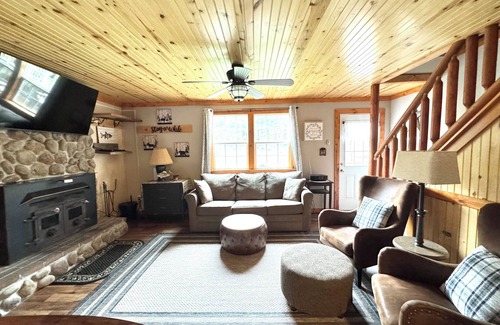 Beautifully surrounded by water. There's a creek in the backyard & a large pond in the front yard of the lodge. Fish or just kick back & enjoy the peace & quiet. The lodge has an open floor plan . The main level - kitchen is fully stocked , the living room is a warm & cozy space with the wood burning stove - bedroom with queen size bed & french doors leading to the back deck- laundry room / office with french doors to the deck & the half bath . The 2nd level offers an open loft with a full size bed - full bathroom with a shower only & the large master bedroom with King sized bed , propane fireplace & french doors leading to a private deck overlooking the back yard with views of Lick Creek. The lodge is centrally located , there's so much to do within a half hour drive . Hiking , Biking, Rickett's Glen , Worlds End State Park , Kast Pond, 25 must see waterfalls , The Haystacks & more .